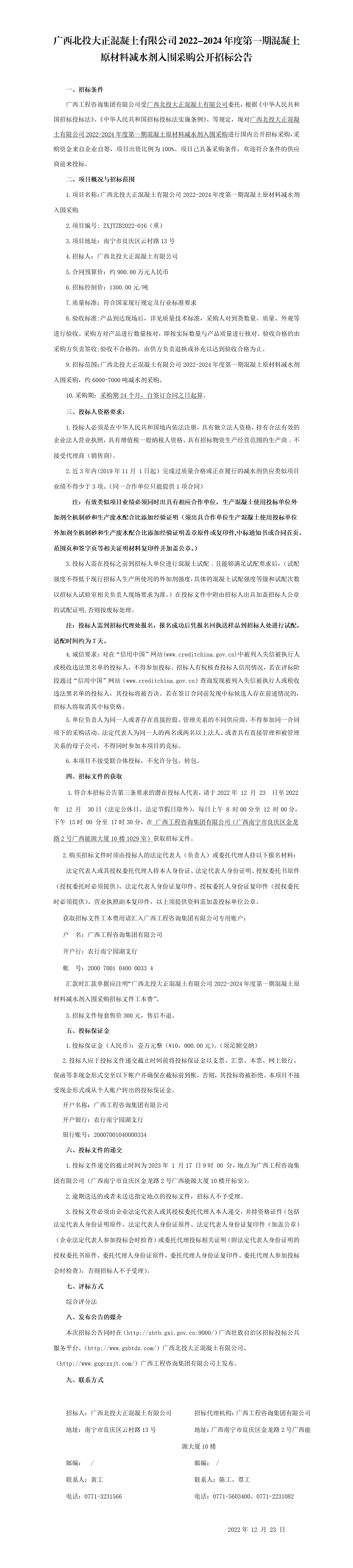 廣西北投大正混凝土有限公司2022-2024年度第一期混凝土原材料減水劑入圍采購公開招標公告