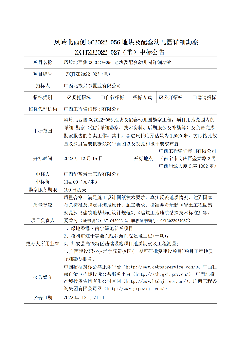 鳳嶺北西側GC2022-056地塊及配套幼兒園詳細勘察ZXJTZB2022-027(重)中標公告